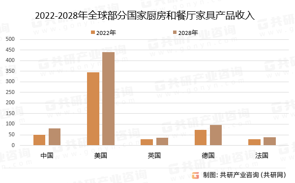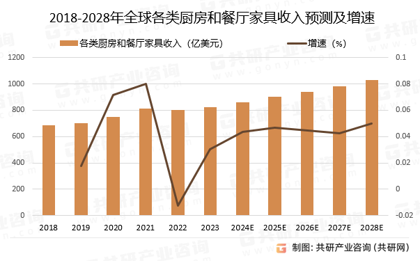 全球厨房和餐厅家具市场在过去几年中呈现稳步增长的态势,2022年厨房和餐厅家具占据家具市场收入的11.27%,位列第三,2023年全球厨房和餐厅家具市场收入将达到824.1亿美元,2018-2028年市场复合年增长率为4.1%,预计2028年全球各类厨房和餐厅家具收入将达到1029亿美元。