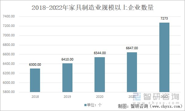 家具产业属于劳动密集型产业,由于产业原材料稳定、行业准入门槛较低,我国家具行业竞争激烈且企业数量多,随着经济的发展,我国已经成为世界上最大的家具生产国。2018年-2022年我国家具制造业规模以上企业数量呈高速增长态势,2022年我国家具规模以上企业数量增长态势迅猛,同比增长9.4%。