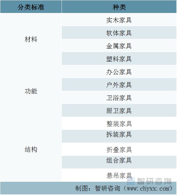 家具是指人类维持正常生活、从事生产实践和开展社会活动必不可少的器具设施大类。家具也跟随时代的脚步不断发展创新,到如今门类繁多,用料各异,品种齐全,用途不一。根据分类标准的不同家具产品有不同的分类,如依据制作原材料分类,家具产品可以分为实木家具、软体家具、金属家具、塑料家具等。