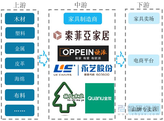 家具制造业指用木材、金属、塑料等材料制作的,具有坐卧、储藏、间隔等功能,可用于住宅、旅馆、办公室、学校等场所的各种家具的制造。家具产品的特性决定了家具行业在经济社会中的重要地位,随着经济的不断发展,家具产业也迅速发展。家具行业的上业主要为木材、塑料、金属、皮革、海绵、布料等主要原材料;中业则为家具的生产制造企业;下业为家具卖场、电商平台、品牌专卖店等销售渠道。