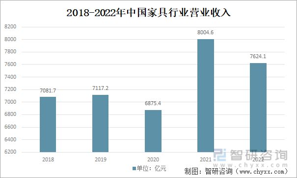 改革开放四十多年来,我国已经成为世界第二大经济体,人均可支配收入不断提高,居民购买力提高,为家具行业提供了良好的发展条件。2018-2021年我国家具行业营业收入波动上升,2021年家具行业的营业收入增长迅速,较上一年增长了1129.2亿元,受疫情和外贸影响,2022年家具行业营收有所下降,但随着经济回暖,家具行业营业收入势将重回增长态势。