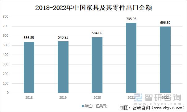 欧美等发达国家经济发展水平高、城镇化率高。居民消费能力强,对于家具的品质要求高,需求量大。此外一些发展中国家加快城市化进程,对于住房的需求增长,带动了对家具行业的需求。我国作为全球最大的家具行业出口国,2018年-2022年家具及其零件出口金额整体上呈现出波动上升的局面,未来随着疫情的影响缓解、外贸环境改善,家具及其零件出口金额将再次回升。