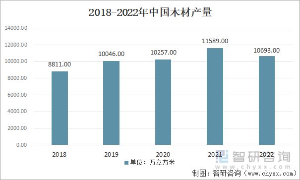 木材是家具行业最主要的原材料之一,我国的森林资源丰富木材产量居全球前列。2018-2021年我国木材产量呈现不断增长的态势;受到结构性需求调整以及经济增长放缓的影响,2022年我国木材产量出现下降局面,产量较2021年减少7.73%。
