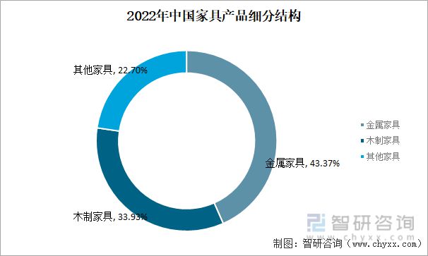 2022年我国家具市场占比份额最大的为金属家具,达43.37%;其次是木制家具,占比达33.93%