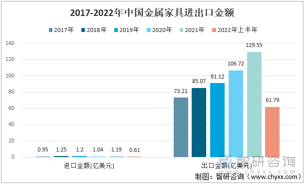 从进出口金额来看,随着中国金属家具行业的发展,生产规模整体不断扩大,我国已成为金属家具全球主要出口国之一,金属家具的出口金额远大于进口金额,2017-2021年出口金额呈现向上攀升的趋势,2022年上半年金属家具进口金额为0.61亿美元,出口金额为61.79亿美元。