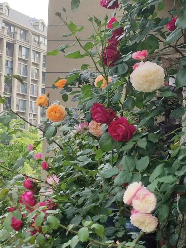 胡女士家的阳台有着类似的景观:南北2个阳台外都种了藤本月季品种,它们横向、纵向不断攀爬,从一个阳台爬到另一个阳台,不断扩张着地盘,也不断创造着美景。