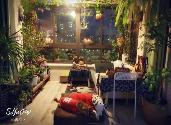这片鲜花绿植仿佛营造了一个室内花园,一张沙发,一张桌子被摆放其中,桌子上有围炉煮茶的用具,2条狗在沙发上睡觉。每天在给花草浇水、处理家务之余,胡女士就在沙发上休息,喝喝茶,看着眼前自己精心浇灌的花草,身心愉悦。