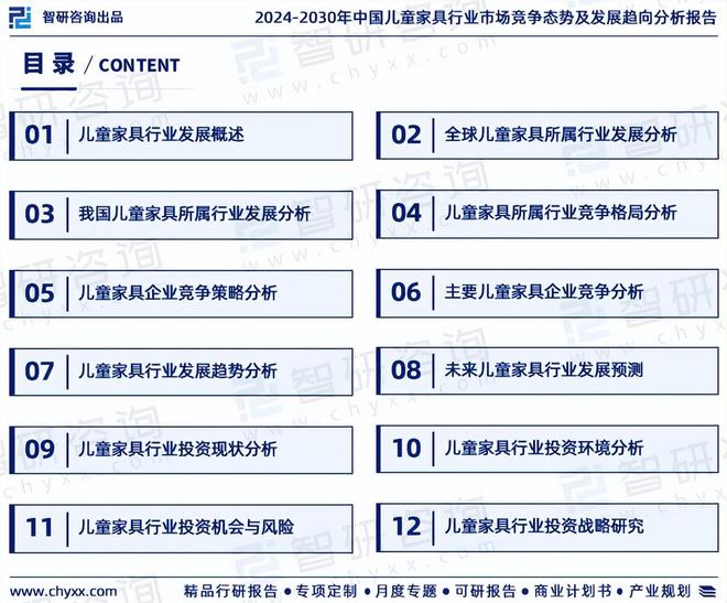 《2024-2030年中国儿童家具行业市场竞争态势及发展趋向分析报告》内容丰富、数据翔实、亮点纷呈。是智研咨询重要研究成果,是智研咨询引领行业变革、寄情行业、践行使命的有力体现,更是儿童家具领域从业者把脉行业不可或缺的重要工具。智研咨询已经形成一套完整、立体的智库体系,多年来服务政府、企业、金融机构等,提供科技、咨询、教育、生态、资本等服务。