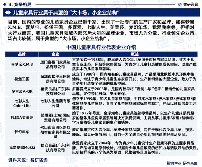 目前,国内的专业的儿童家具企业已逾千家,出现了一批专门的生产厂家和品牌,如喜梦宝X.M.B、喜梦宝、松堡王国、多喜爱、七彩人生、芙莱莎、梦幻年beat365华、我爱我家等,但相对大行业而言,我国儿童家具领域内部充斥大量的品牌企业,市场尤为分散,行业领先企业市场占比较低,属于典型的“大市场,小企业结构”。