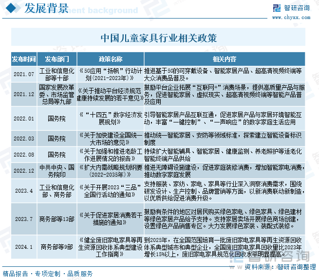 近年来,我国相关部分发布一系列政策支持、鼓励和规范包含儿童家具在内的家具行业发展,如:2023年7月,商务部等13部发布《关于促进家居消费若干措施的通知》,指出:鼓励有条件的地区对居民购买绿色家电、绿色家具、绿色建材等绿色家居产品给予支持。支持家居卖场开展绿色商场创建,设置绿色产品销售专区。大力发展绿色家装、装配式装修。2024年1月,商务部等9部发布《健全废旧家电家具等再生资源回收体系典型建设工作指南》,指出:到2025年,在全国范围培育一批废旧家电家具等再生资源回收体系典型城市和典型企业,全国废旧家电家具回收量比2023年增长15%以上,废旧家电家具规范化回收水平明显提高。