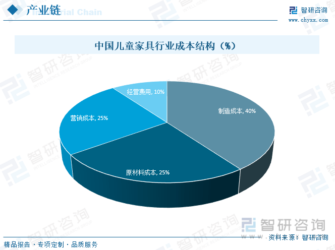 儿童家具生产成本主要由原材料成本、制造成本、营销成本、经营费用四部分构成,制造成本为企业生产过程中投入的厂房建设、器械购置等费用,经营费用包括办公场所租赁等日常运营费用。其中,制造成本(约占40%)占比最大,其次是原材料成本(约占25%)与营销费用(约占25%),占比最小的为经营费用(约占10%)。