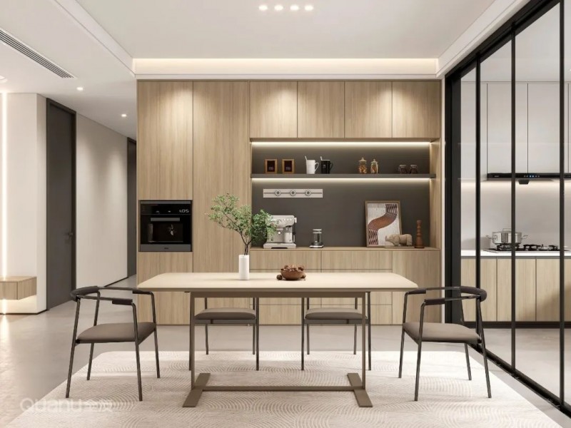 生活动线越短,效率就越高。将咖啡机、水壶等小型电器外移至餐厅后,相应的杯具也存放在餐边柜内,既避免了油污、水渍,减少清洁频率,在日常饮水、泡茶、喝咖啡时也不用再反复进出厨房,缩短了生活动线,提高居家舒适度。