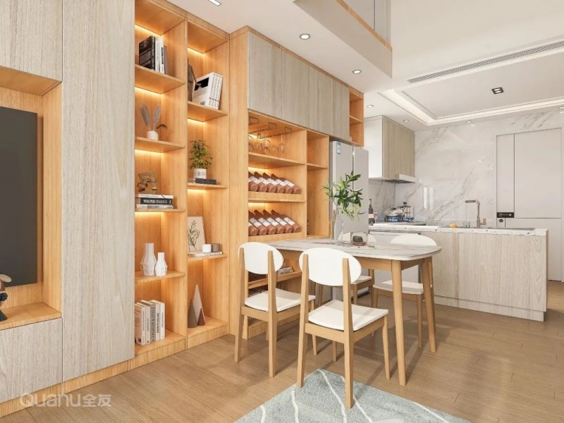 利用转角优势,将餐边柜和玄关柜做一体式设计,中部留空,方便随手置物的同时,放置小型电器也无需顾虑,动线流畅,整体性更强。