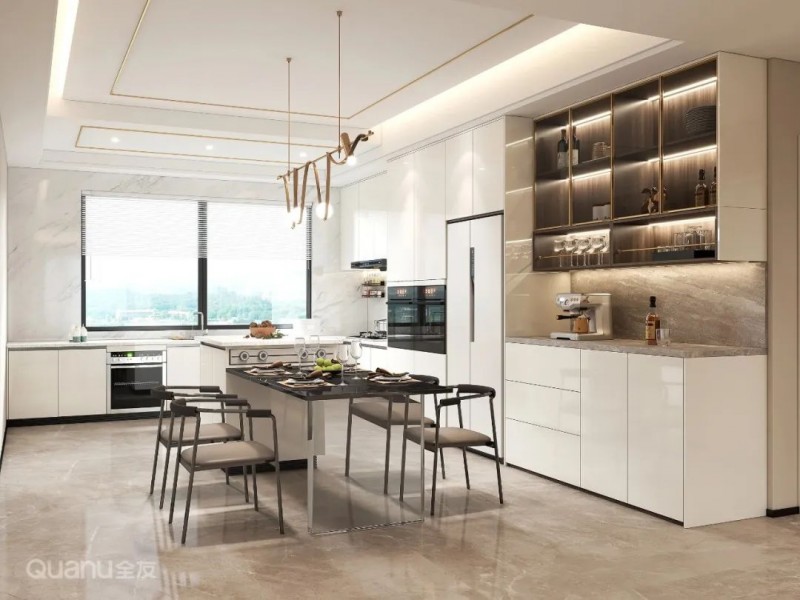 一般适用于开放式厨房,通常呈L型或U型布局,将餐边柜作为橱柜的扩充,冰箱等大型电器也能轻松内嵌,不占多余空间;柜体中部留空设置操作台,中西厨结合,多人操作也不拥挤。