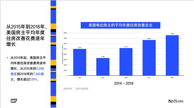 有数据表明,从2015年到2018年期间, 美国房主平均年度 住房改善花费逐年增长 ,从2015年的3,288 美金到2018年的7,560美 金,增长超过129%。后院或露台是他们在夏天最受欢迎的DIY项目。