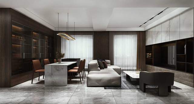 在开放式的空间布局,设计师将空间中的饰面墙、电视柜、展示柜、收纳柜等进行有机串联,铺设出连贯轻简而自如的功能氛围,不同的饰面表现模式穿插其间,塑造出维度丰富、视觉饱满的一体化系统,更将意式的优雅与沉稳弥散进空间的每个角落。