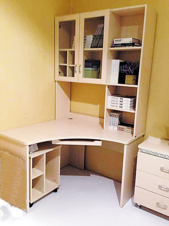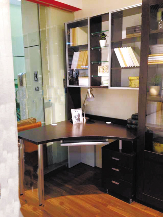 转角设计充分利用居室角落的狭小空间,坐在电脑桌边能轻松取用柜里的书籍,简约且方便。
