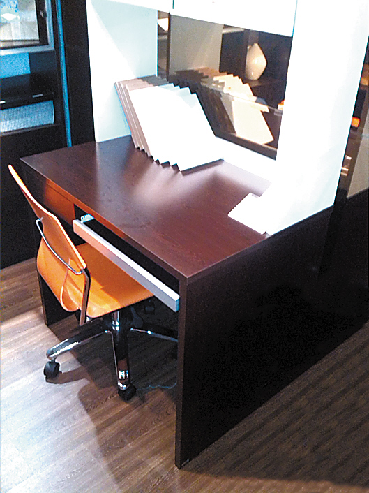 整体尺寸较小,书柜部分喷上金属漆,隐约透出金属光泽与现代感,与棕色实木搭配带来视觉冲击。