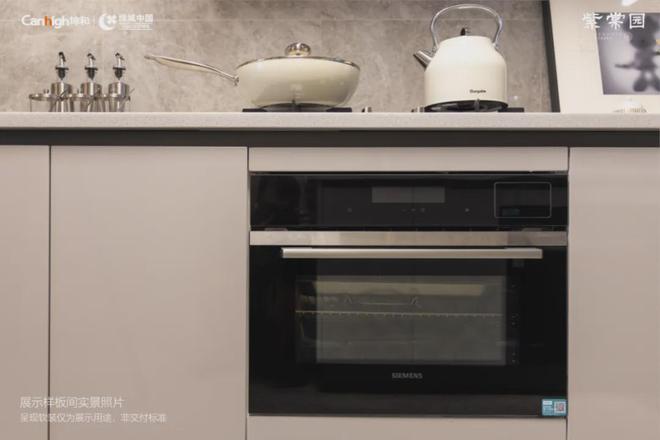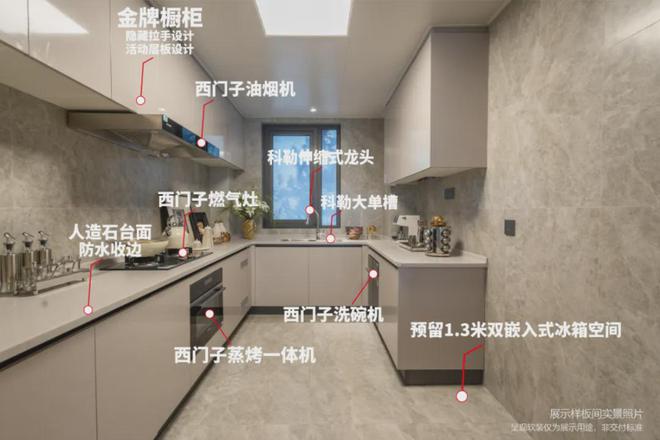 厨房不遑多让,配备西门子四件套(油烟机、燃气灶、洗碗机、蒸烤一体机)(最终装修配置以合同备案为准);水槽为科勒大单盆包含科勒伸缩式龙头,方便清洗;同时预留了约1.3米冰箱空间,即使使用双嵌入式冰箱也能够摆放。