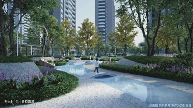 又比如,阳光草甸、紫棠微漾、奇幻漂流、紫棠花厅等组成的中轴大境。在视觉层面上打破了传统的平面布局,营造了更立体的互动休憩空间。