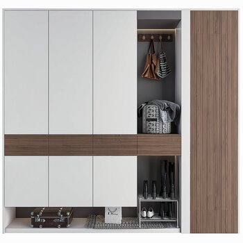 入户处整个空间比较狭长,进门之后是类似走廊的空间,玄关柜可分别在进门两侧墙面,做双排柜,实现最大beat365官网化利用空间。